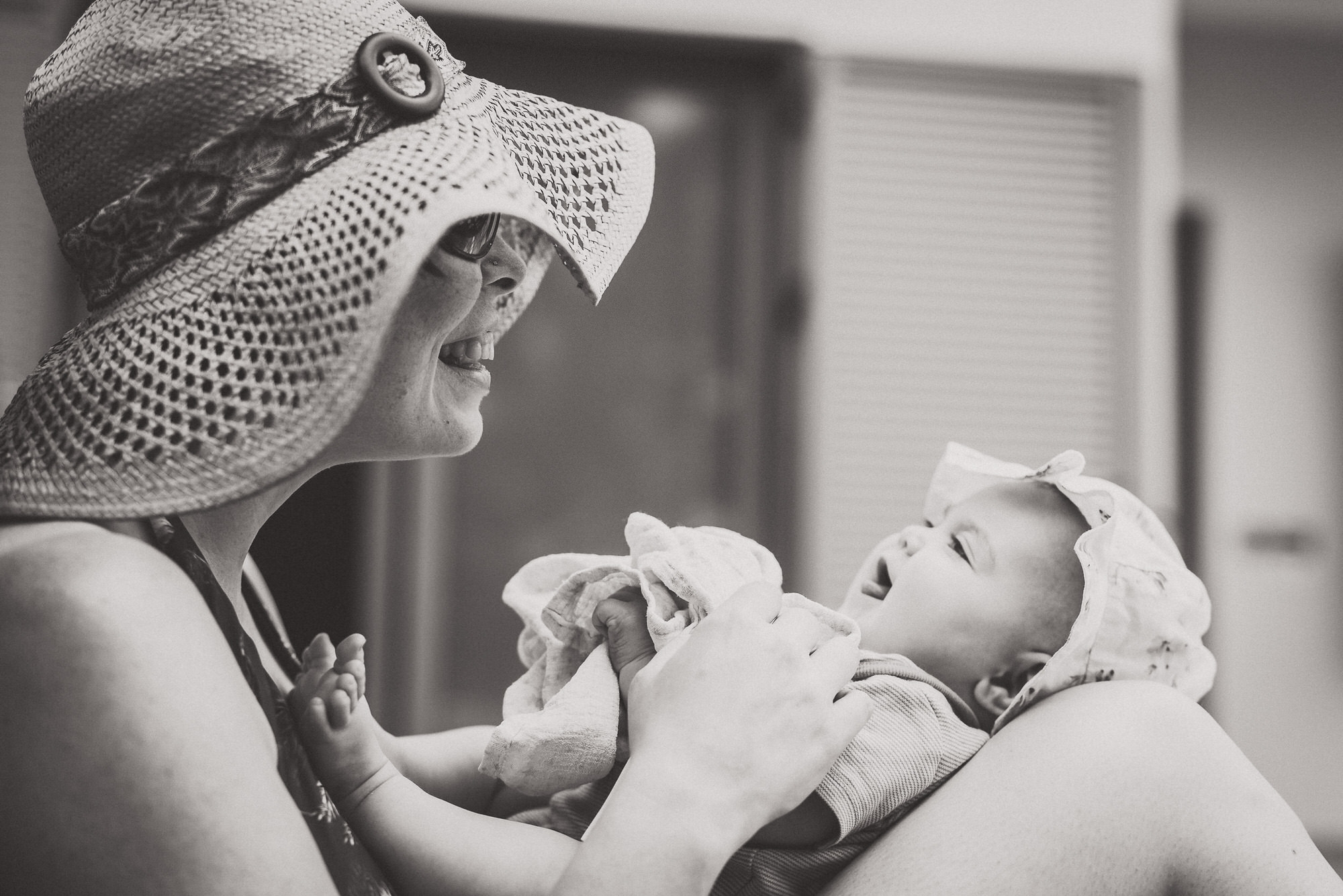 Black and white photo of a woman holding a baby taken by a wedding photographer.